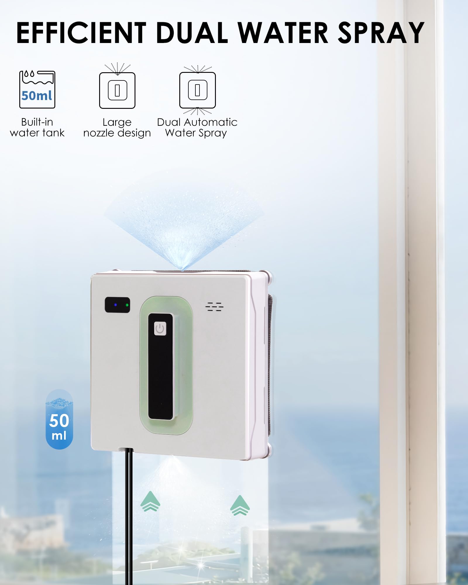 - 【Dual Water Spray】Water Spray Nozzles are equipped on two sides of the window washing robot. The water spray nozzle on the running direction side will spray water, making it more effective when cleaning. The water spray function can be controlled either automatically or manually. Additionally, the window cleaner machine is designed to emit a voice alarm when there is insufficient water in the 50ml water tank