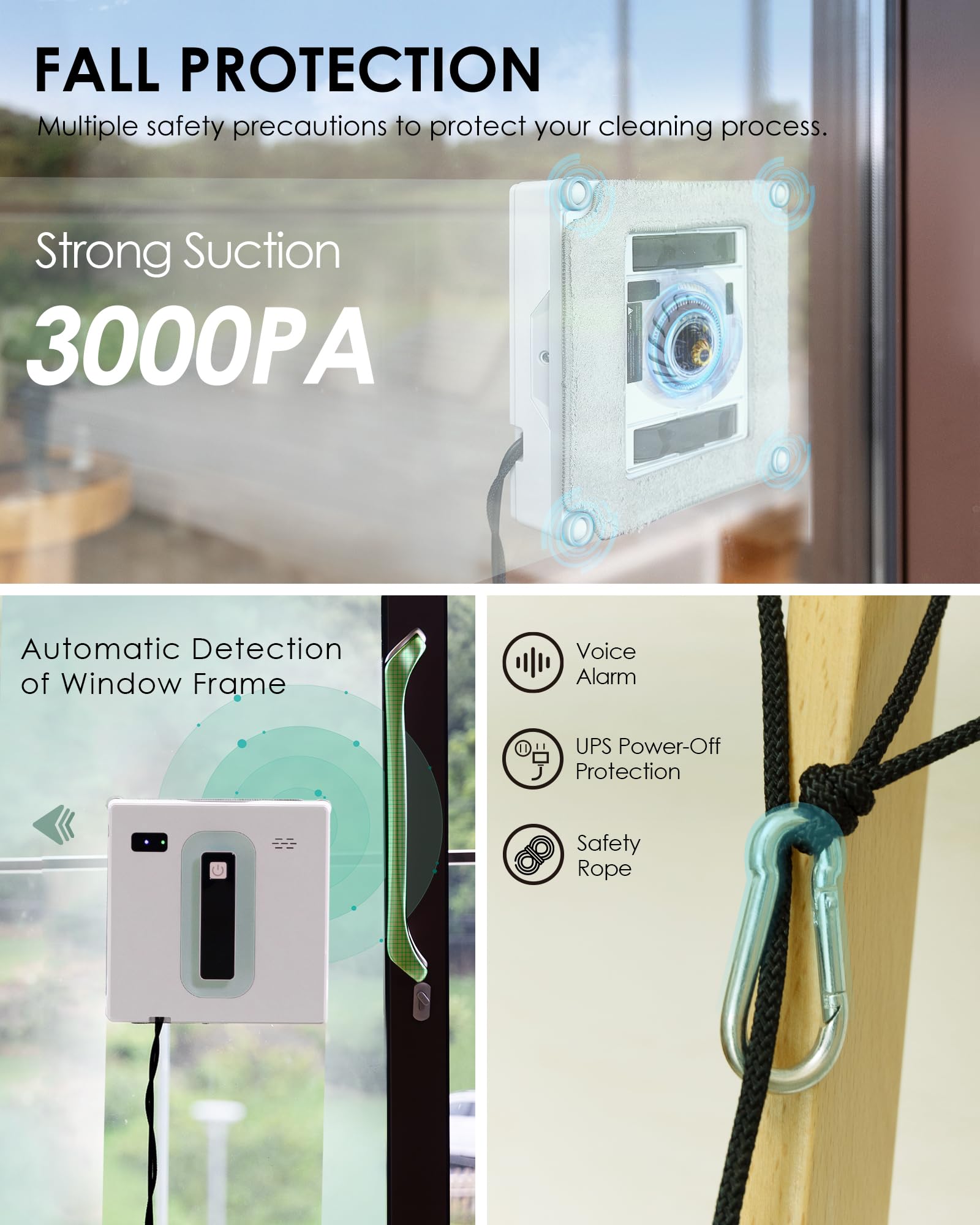 - 【Multiple Safety Protection】The window robot's suction power of approximately 3000Pa and bearing force of 7KG ensure that it can firmly grip onto glass surfaces. Usually working at a voltage of 110V. In the event of a power failure, the robot emits a voice alarm and its UPS power-off protection prevents it from falling immediately. It is recommended to always use the safety rope when operating the robot