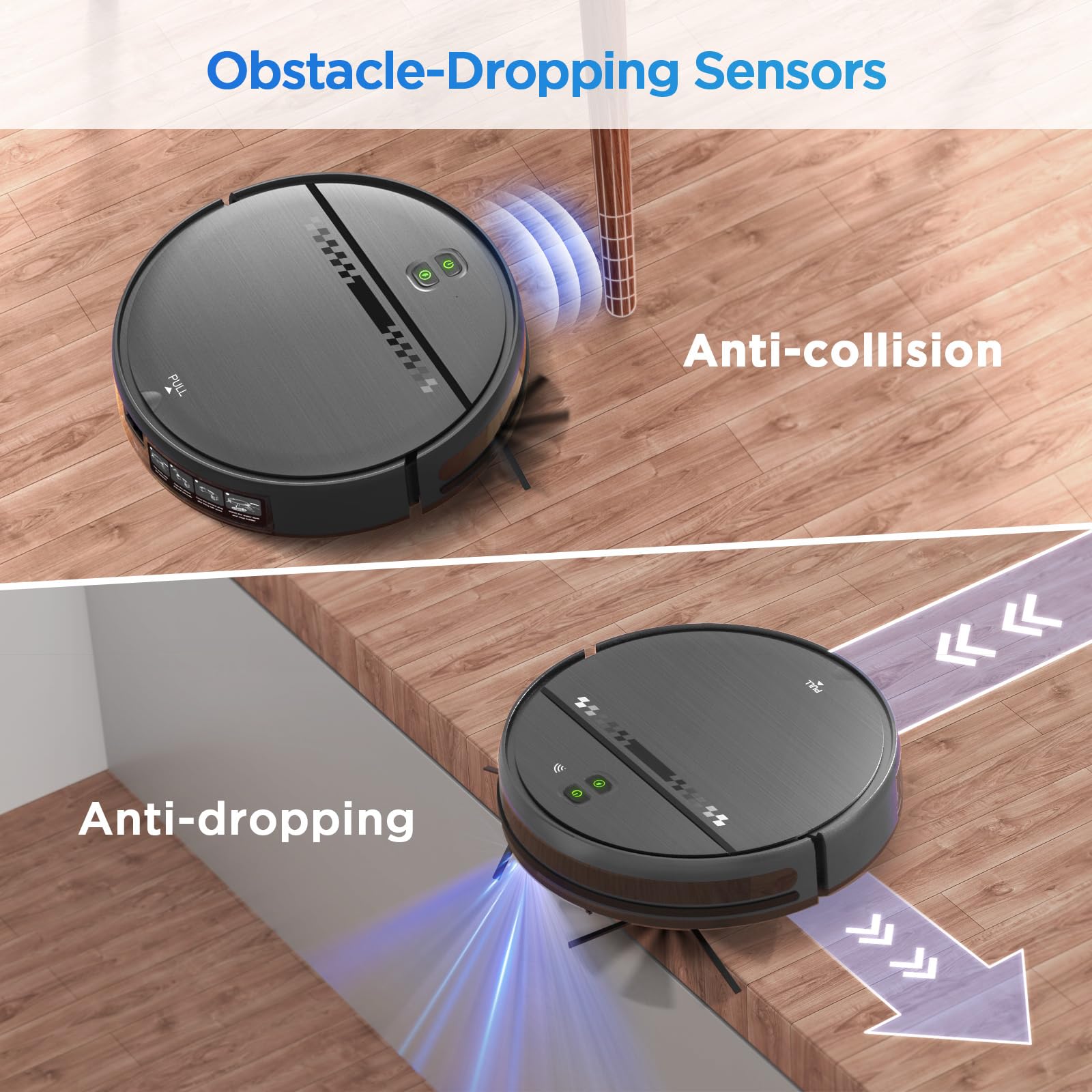 - Anti-Bump and Anti-Fall: Robotic vacuum cleaner including anti-drop sensors and an infrared buffer anti-collision board, is impressive as it allows the vacuum to navigate and clean efficiently without colliding with obstacles or falling off stairs. Additionally, the boost-Intellect technology automatically adjusting the suction power when transitioning from different floor surfaces is a convenient feature.
