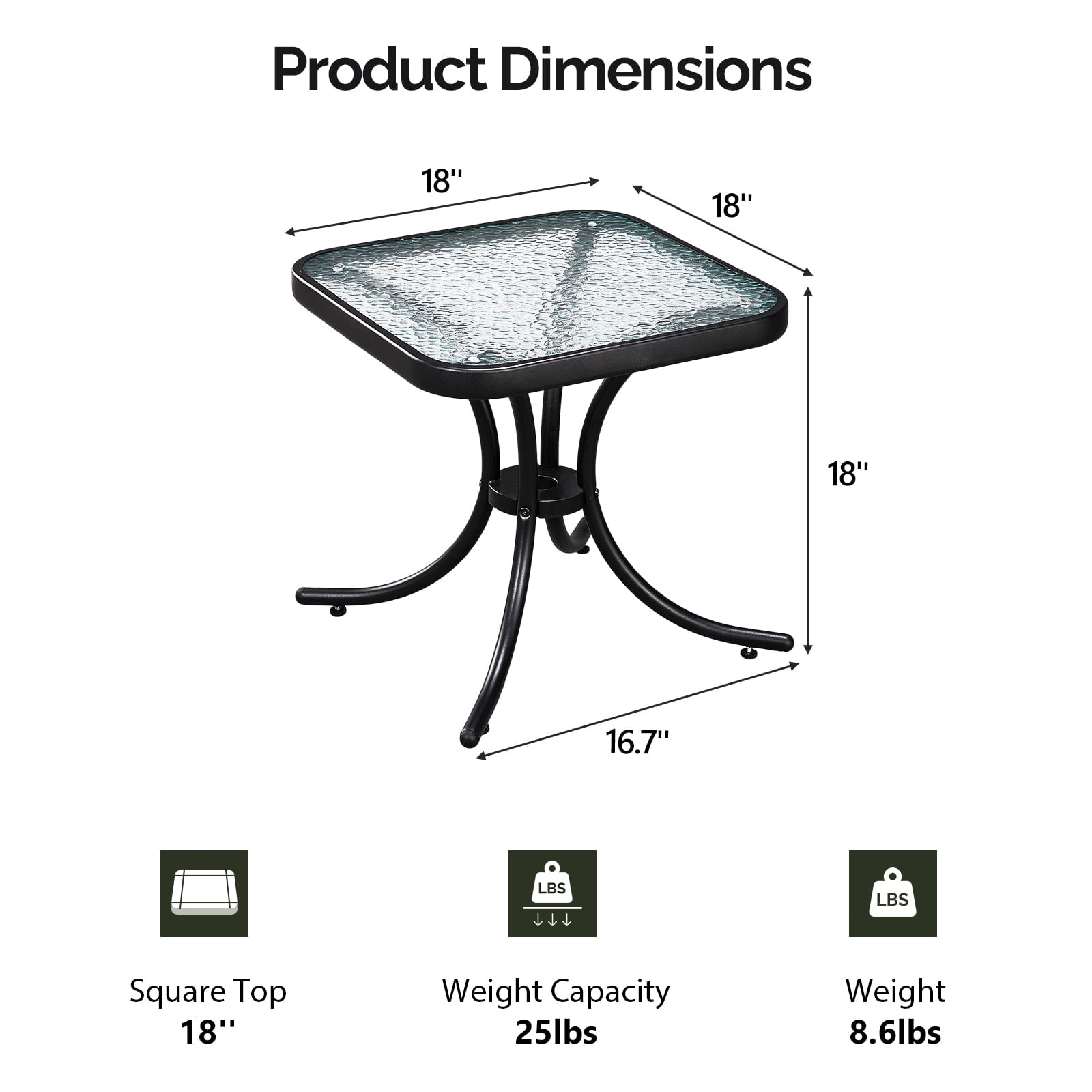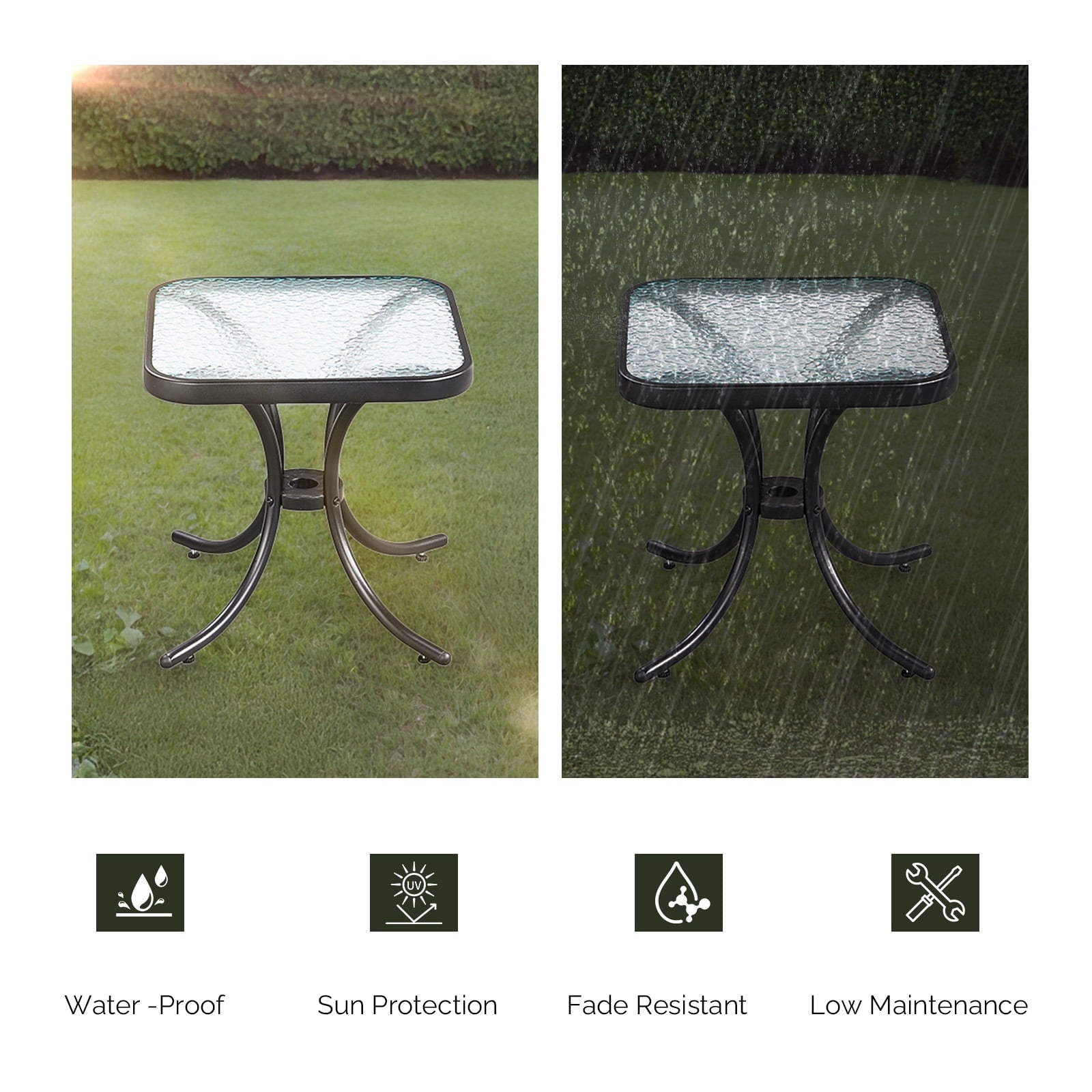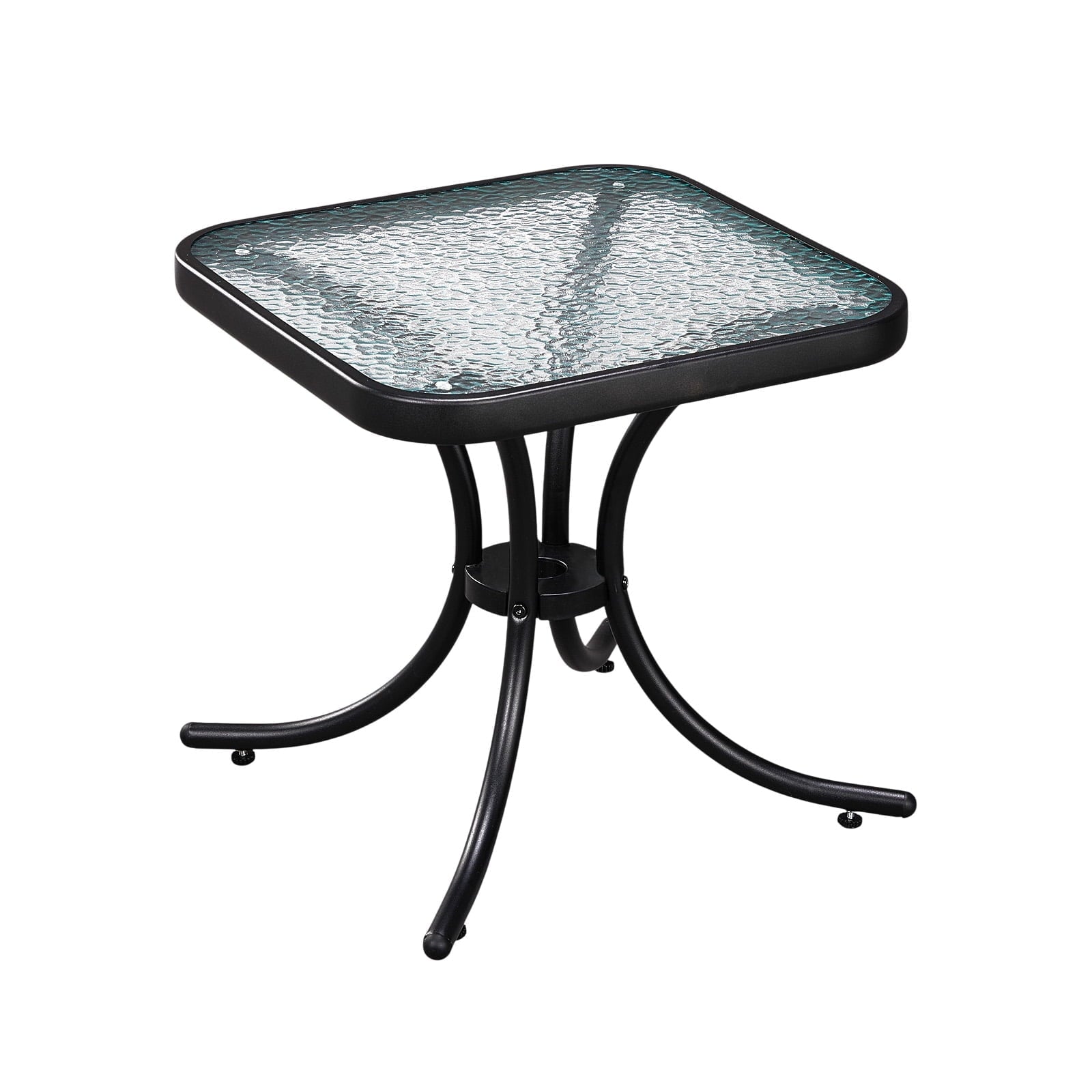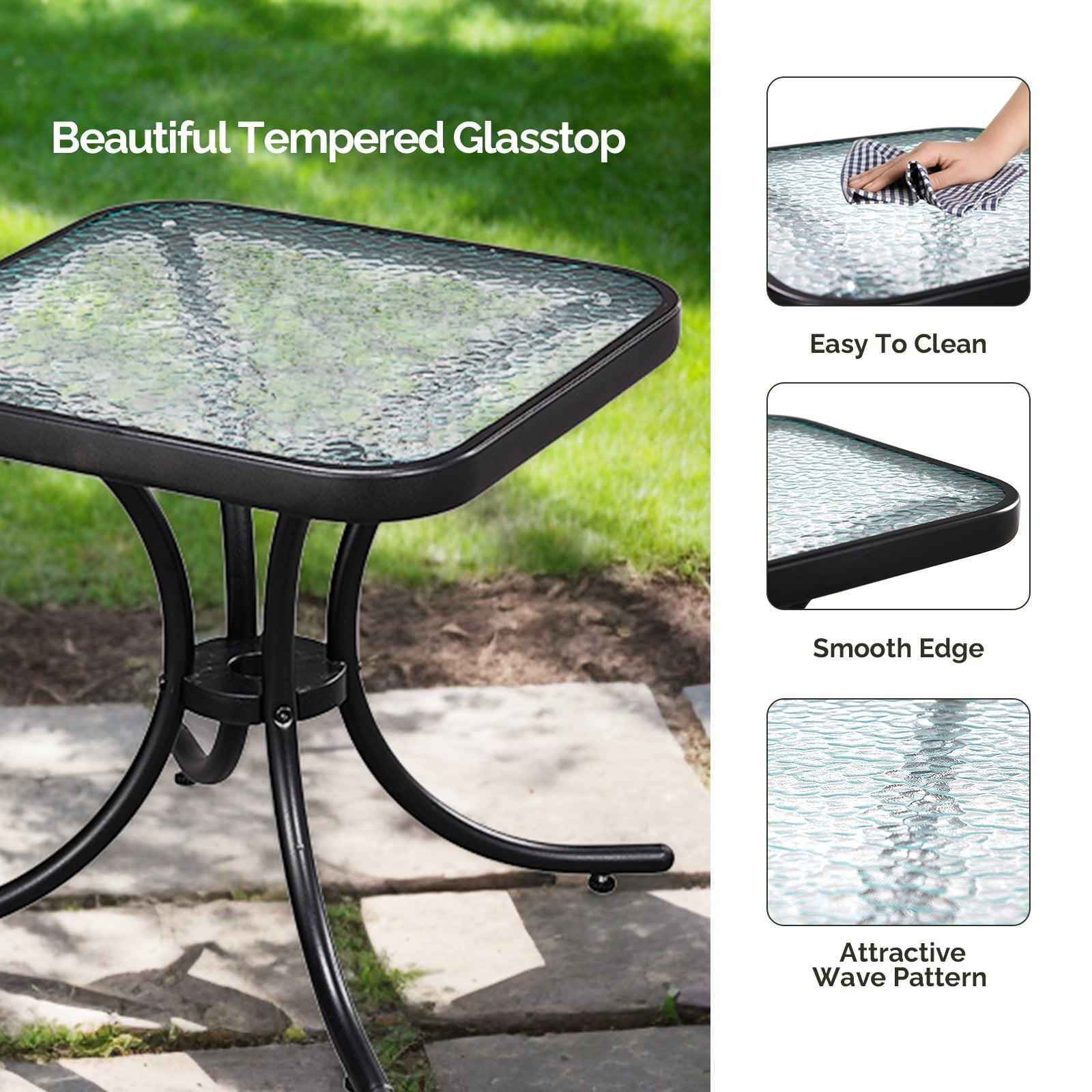 Elevate your outdoor area with the Zimtown 18' Square Tempered Glass Outdoor Patio Side Table! This glass side table features a scratch - resistant, ripple - textured tempered glass top for a sleek look and easy cleaning. Its heavy - duty metal frame with a powder - coated finish ensures weather resistance and stability. Adjustable foot pads prevent wobbling. With an 18in top, it fits various settings as a patio end table or outdoor side table, offering space for drinks or decor. Perfect for patios, balconies, and more, it adds a modern touch as a patio coffee table.
